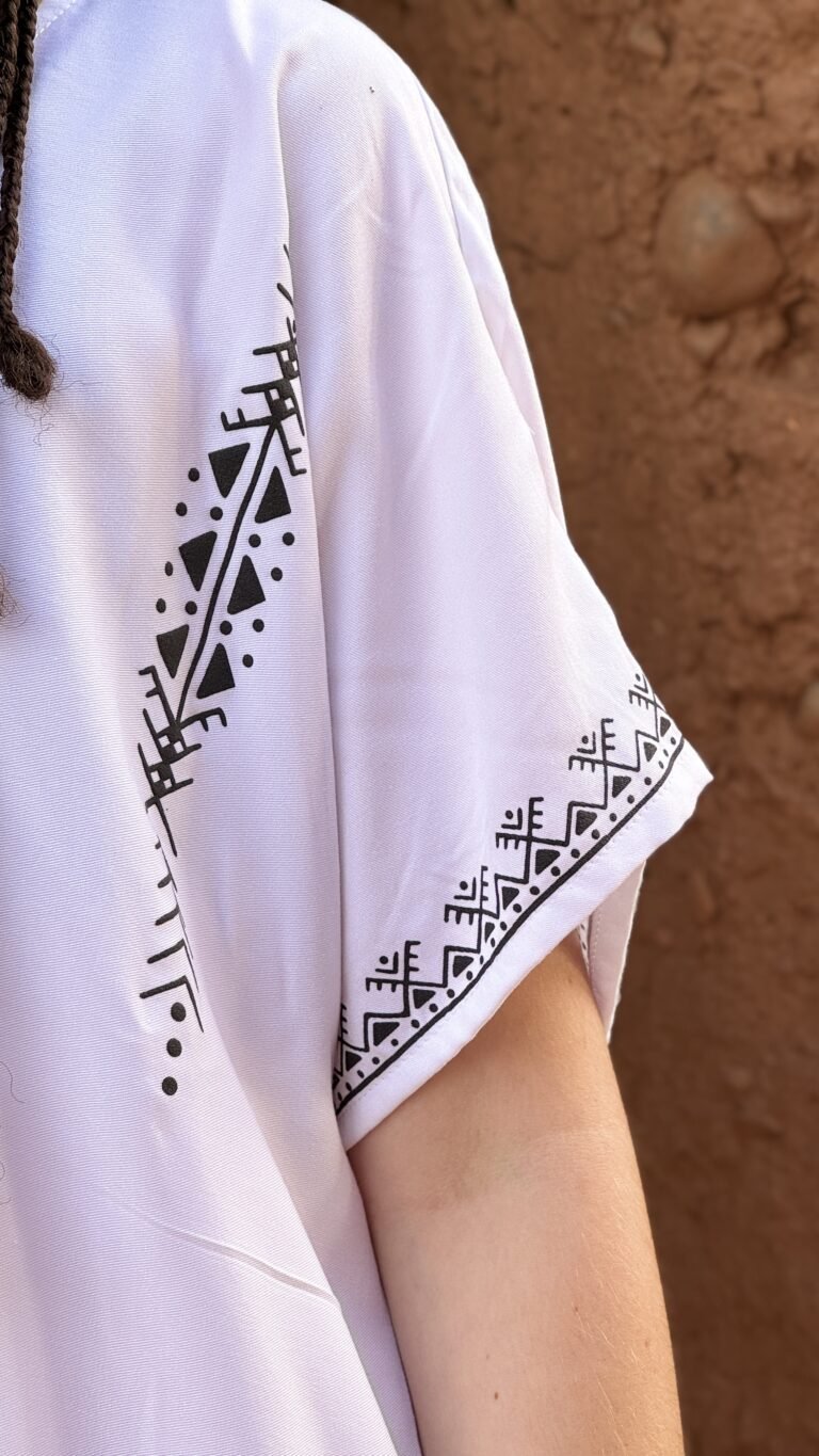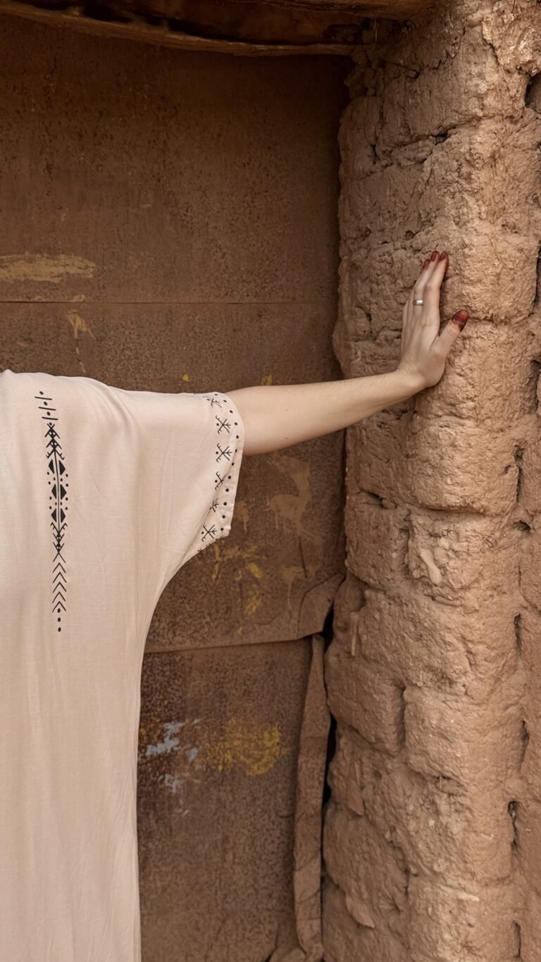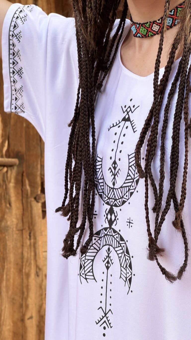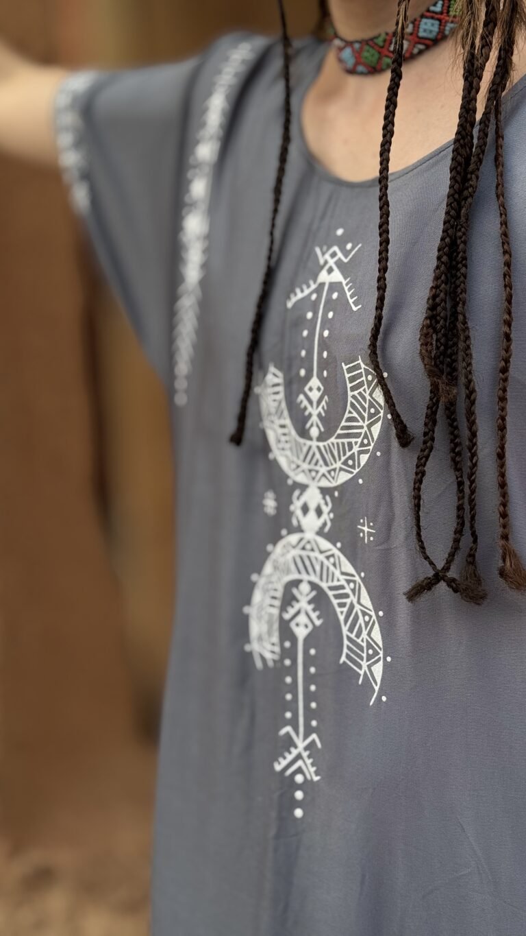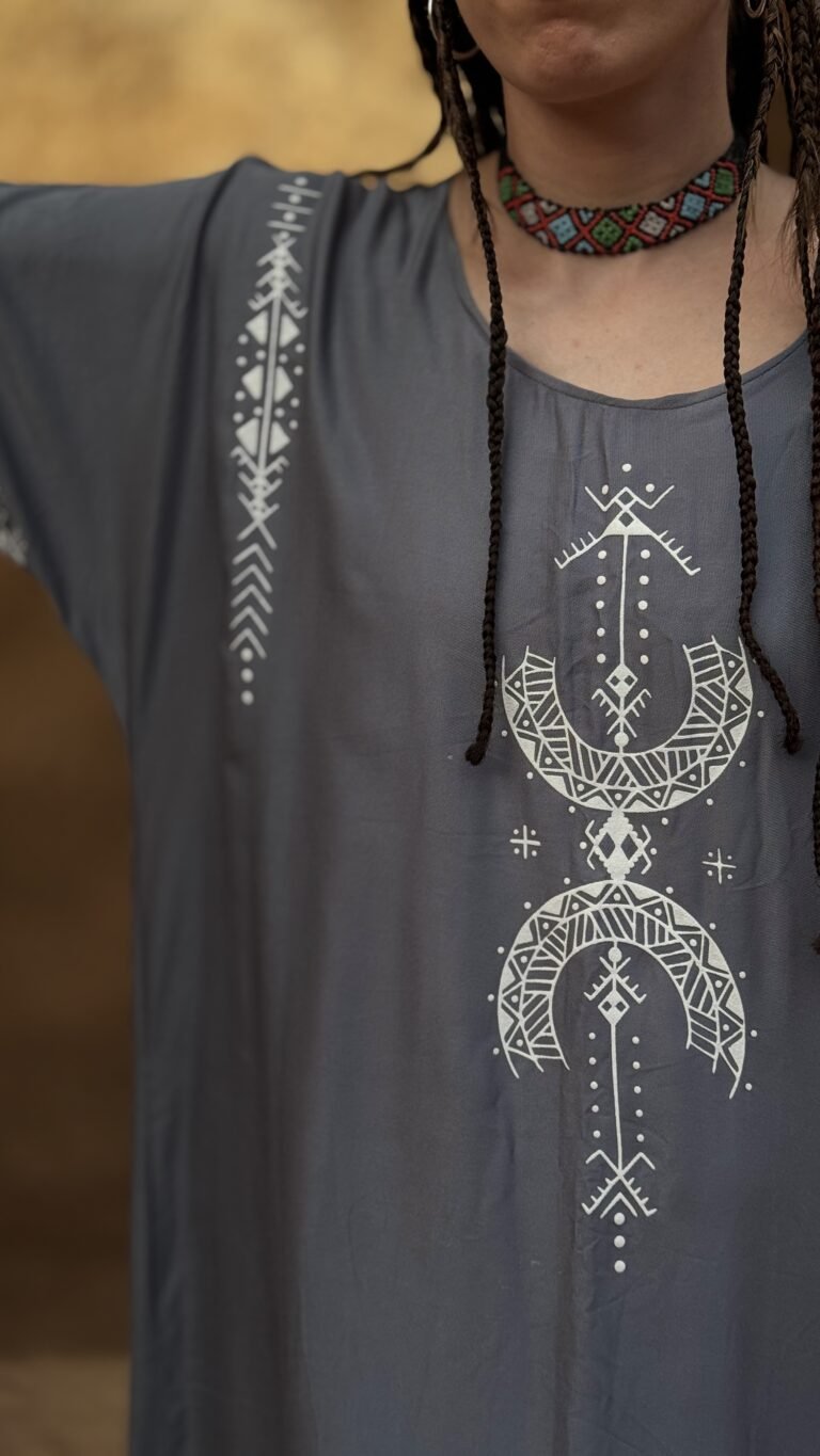 Modèle et confection exclusifs d’AfusArt. Le design est une composition de symbolisme amazigh inspiré des tatouages réalisés par les femmes. Des créations uniques et spéciales, chargées de sens et d’histoire, originales d’AfusArt.
