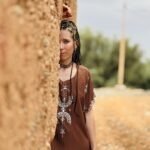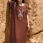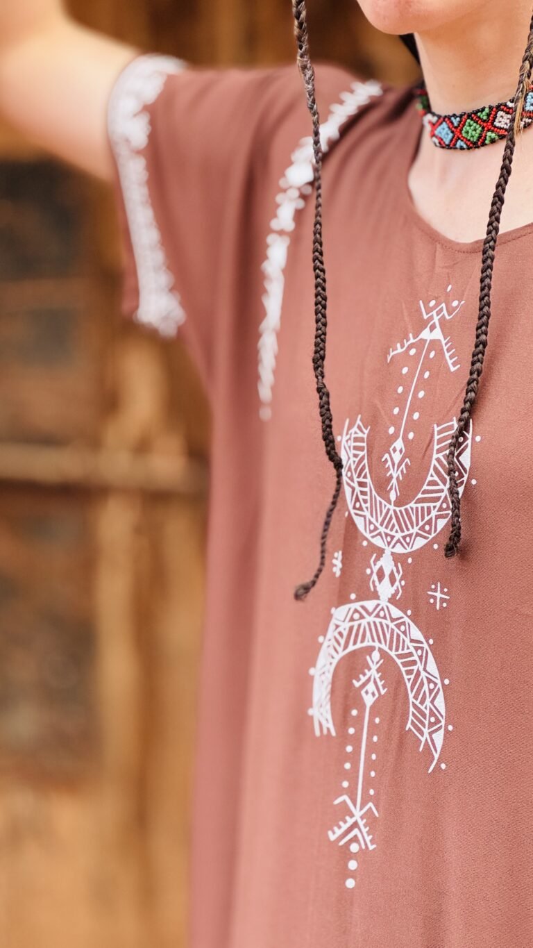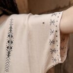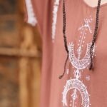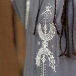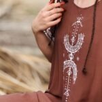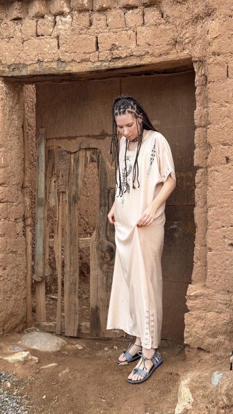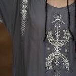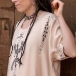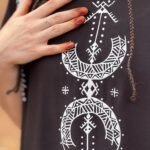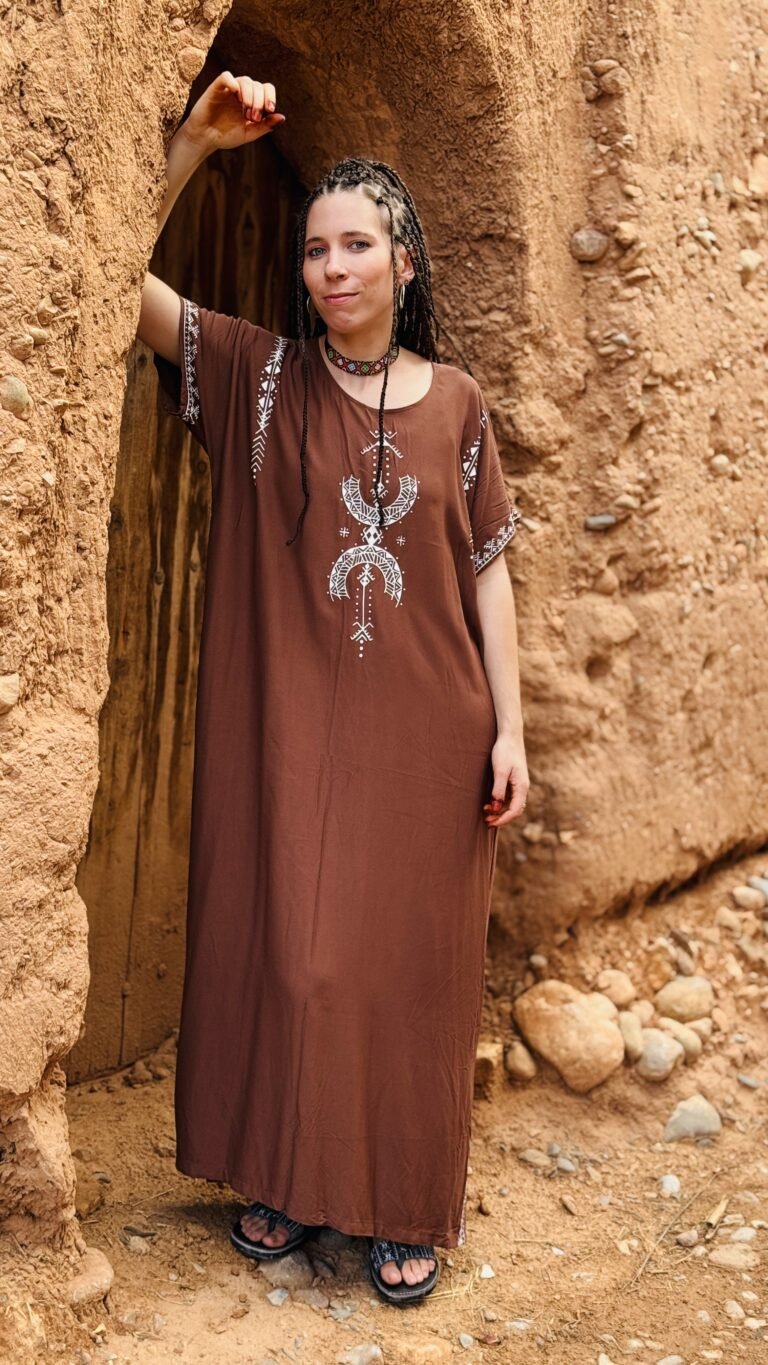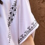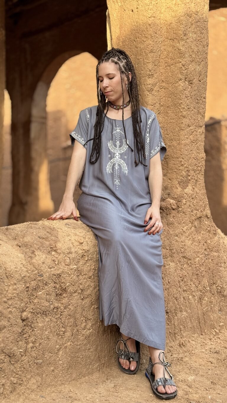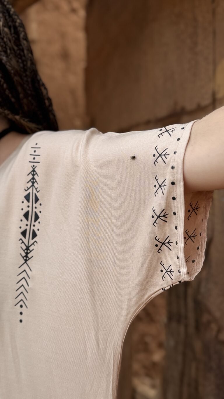 Modèle et confection exclusifs d’AfusArt. Le design est une composition de symbolisme amazigh inspiré des tatouages réalisés par les femmes. Des créations uniques et spéciales, chargées de sens et d’histoire, originales d’AfusArt.